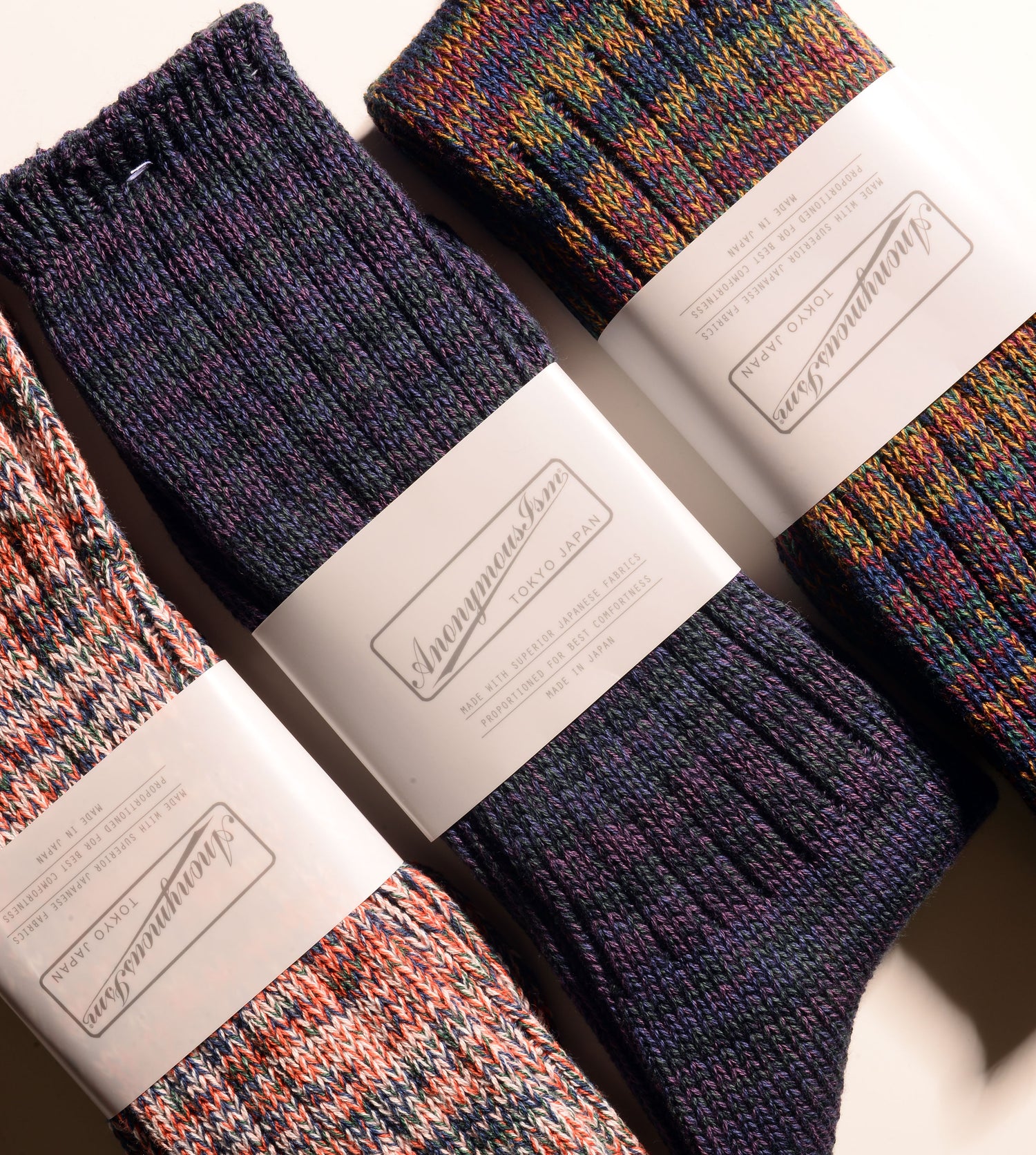 The 5-Color Mix Crew is a signature piece from Anonymous Ism, blending craftsmanship with quality. The fabric, carefully crafted using a unique over-gauge technique on low-gauge machines, achieves a perfect balance of softness, thickness, and durability. Made with vibrant, high-quality combed yarn, the socks reveal a rich, colorful pattern as the five hues intertwine beautifully, creating a distinctive and dynamic look.