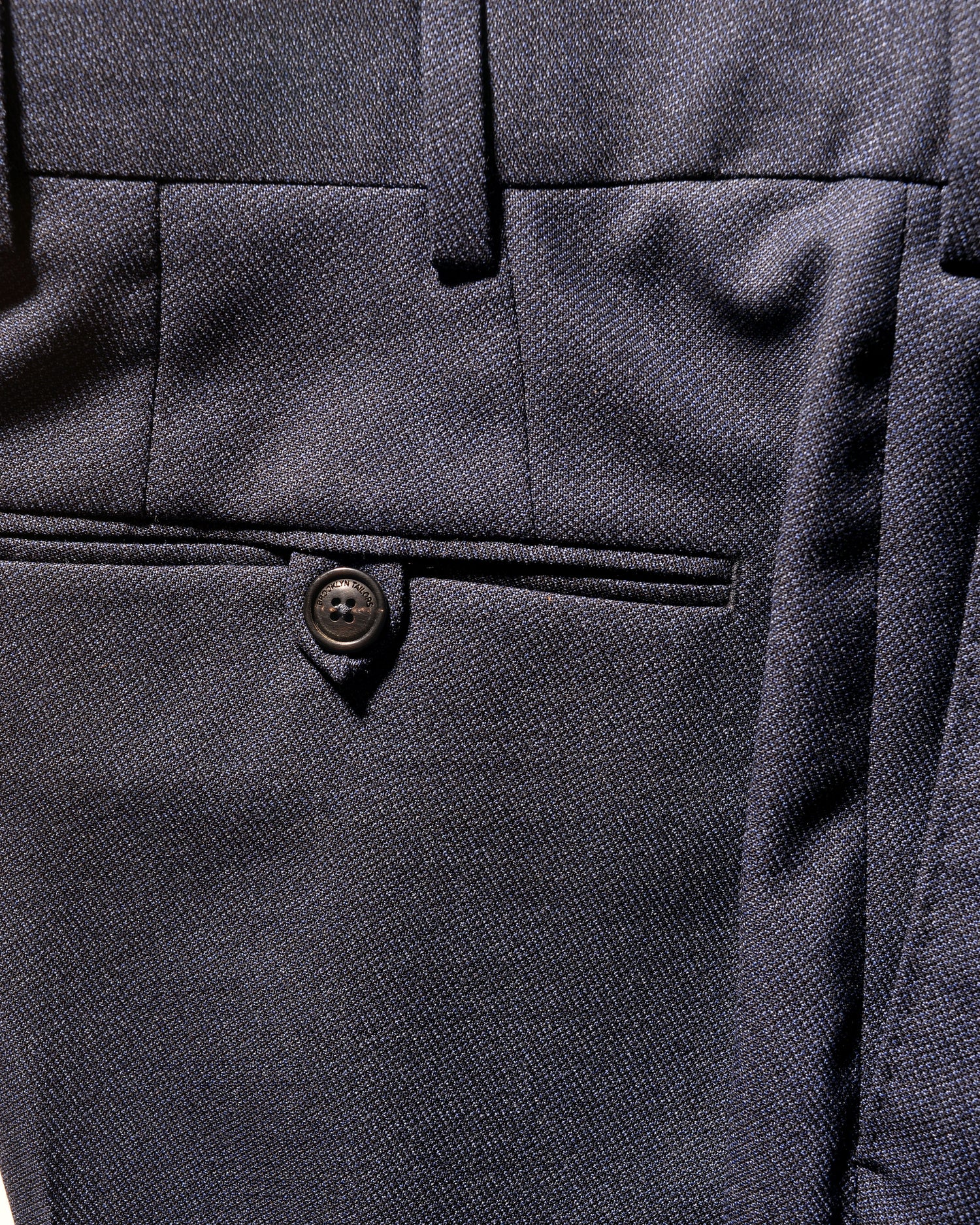 This suit stuns with both a gorgeous fabric and deep, inspired color. This is a Super 130s fabric, so soft and luxurious, in a 7.5oz mid-weight that holds its shape, but isn't stiff or hot. It's a subtle twill weave, adding extra texture. The color is a marled yarn, which blends together various tones of navy blue, creating a truly special piece.