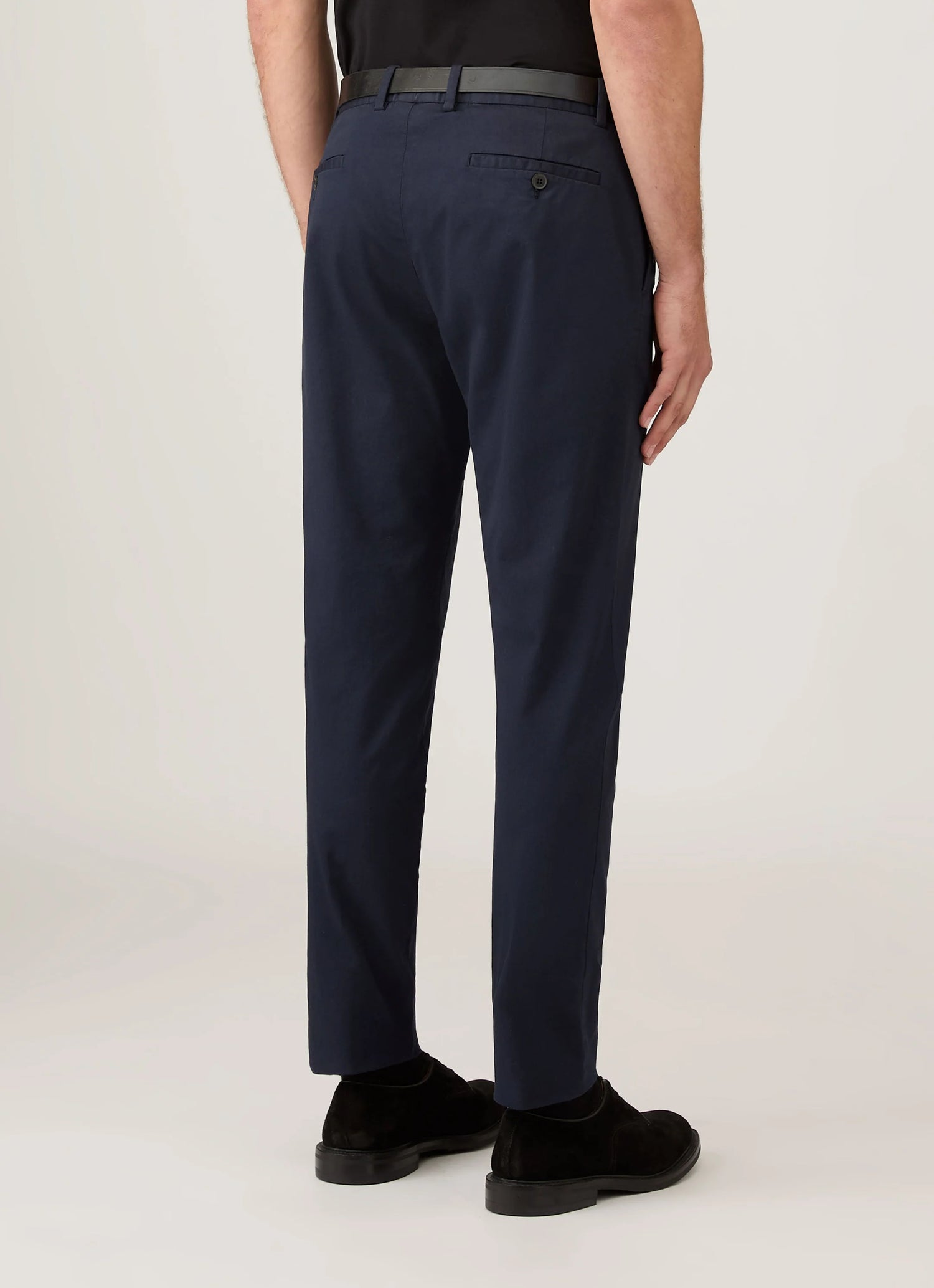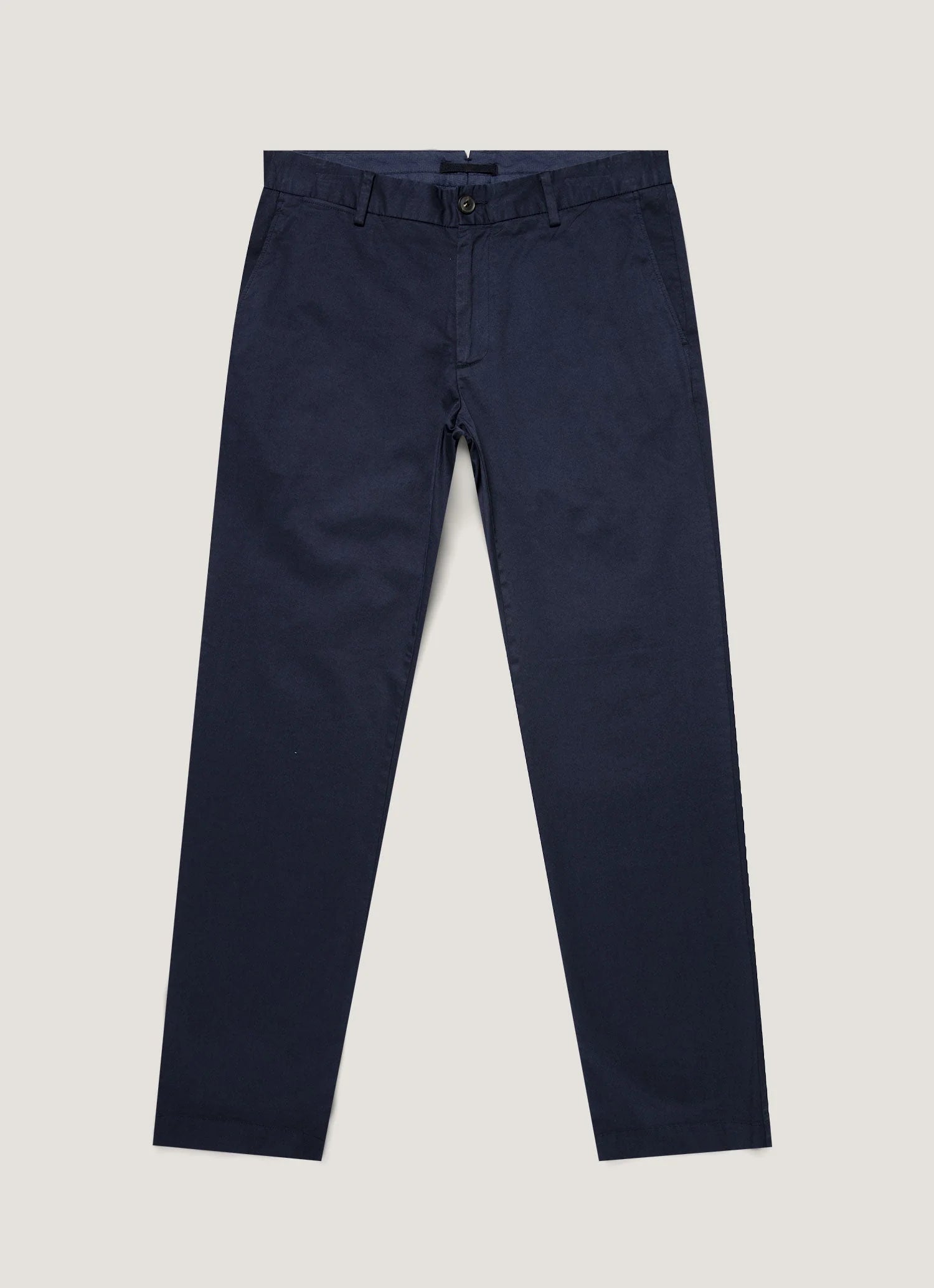 A slim-fit chino with a mid-to-low rise and a classic flat-front design. Crafted from lightweight Italian cotton with a touch of stretch for added comfort, and garment-dyed for a soft, casual feel. Finished with a tailored waistband, button closure, zip fly, and single welt back pockets.